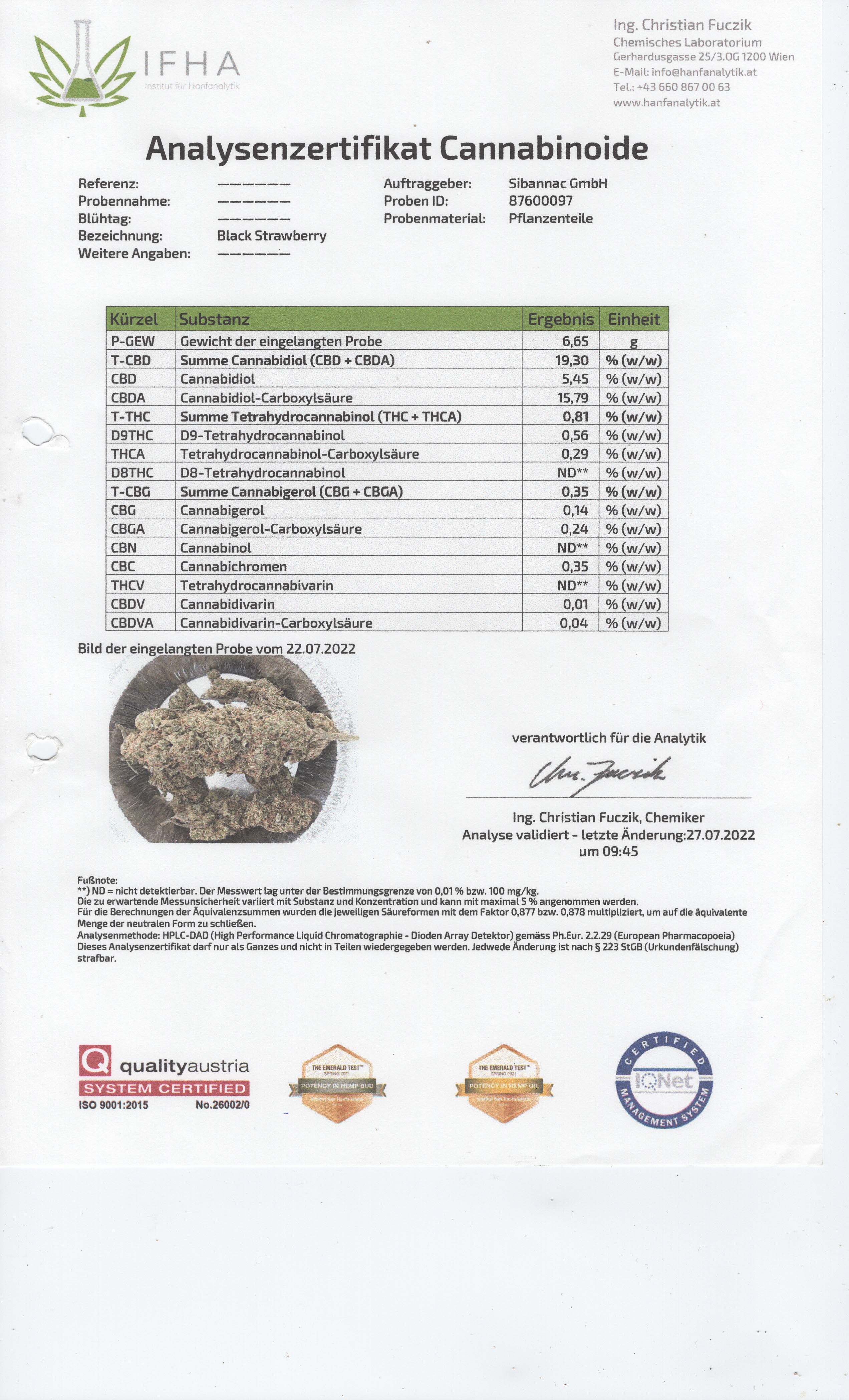 Das Öl ist ein Vollspektrumöl, es wird kein CBD-Isolat zugesetzt. Das Cannabinoid-Spektrum wird dadurch nicht verändert, so dass ein Öl hergestellt wird, das genau dem Cannabinoid-Spektrum der kultivierten Pflanzen entspricht.