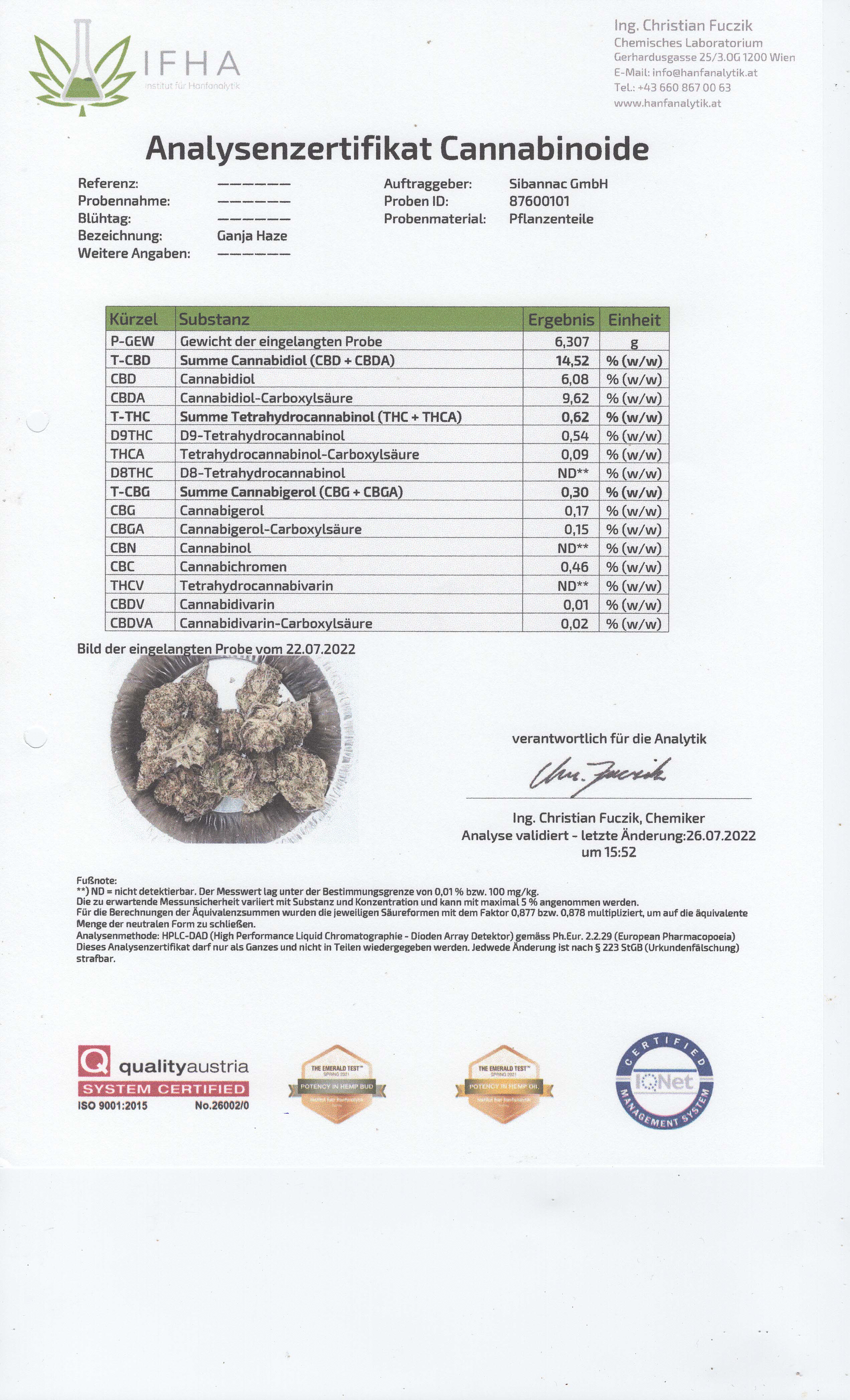 Die Bestimmung von Cannabinoiden erfolgt bei uns bei niedrigen Temperaturen (max. 60°C) mittels HPLC, um eine differenzierte Aussage über den Gehalt der Säureformen (CBDA, THCA, CBGA …) und der neutralen Wirkstoffe (CBD, THC, CBG…) erstellen zu können.