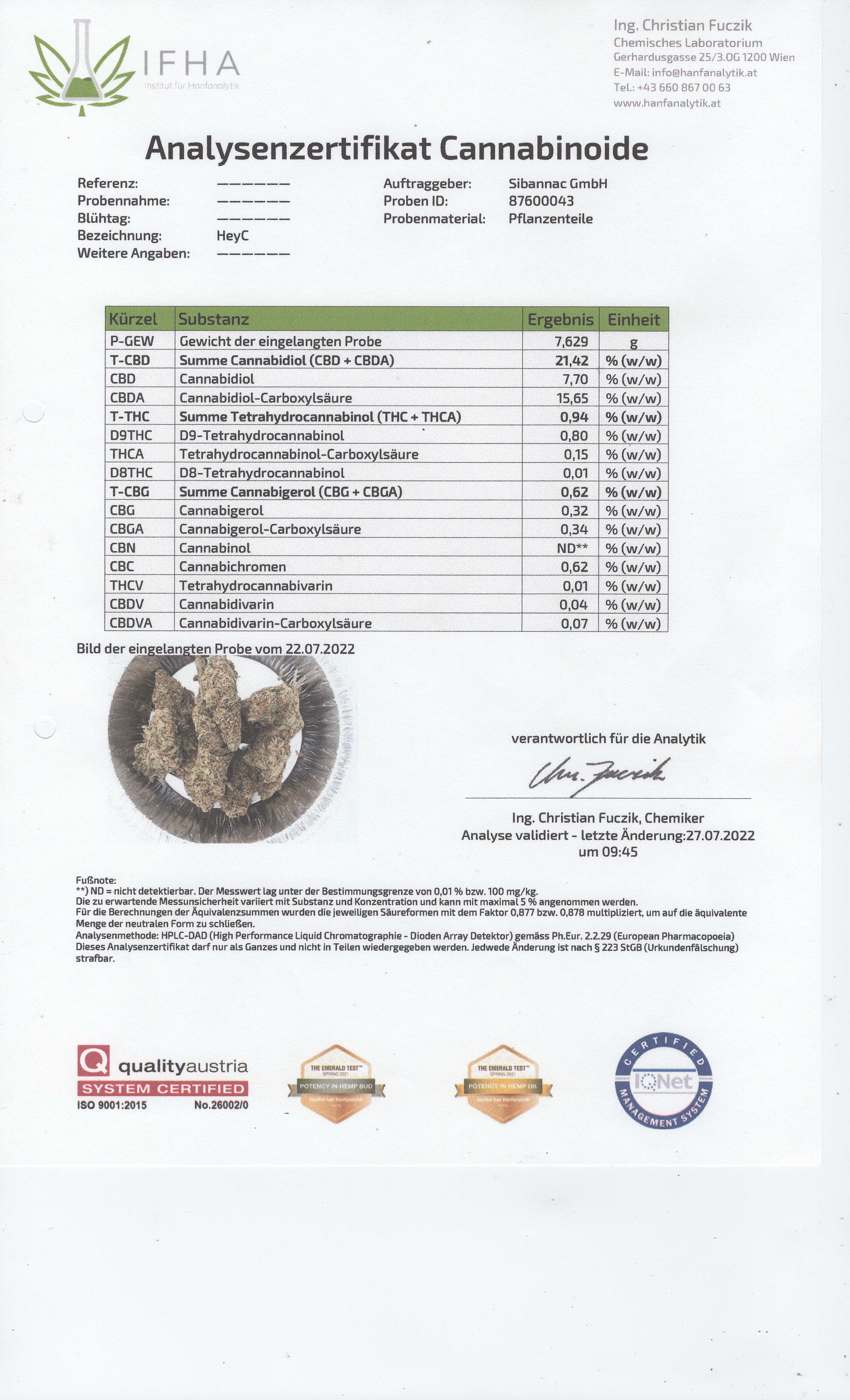 HeyC, ausgesprochen wird es "Heysi" ist unsere Sorte, die am meisten an die gute alte Old School Sorte Haze erinnert. Haze ist legendär für ihren Duft und ihre LSD-ähnliche Wirkung. HeyC hat genau diesen Duft, aber natürlich nicht so eine Wirkung, da es unter 1% THC ist. Wir finden aber das die vielen Cannabinoide und die grosse Terpenvielfalt das HeyC zu etwas besonderem machen. Der Duft ist unverkennbar harzig. Tropisch, fruchtig, nicht zu süss, mit wenig Würze. Der Effekt von HeyC ist perfekt um zum Beispiel kreative Arbeiten zu erledigen oder sich in Tagträume zu verlieren.